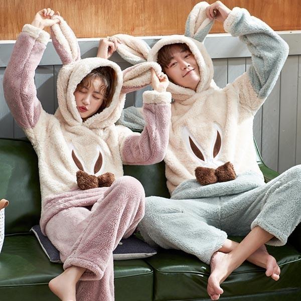 Minana ペアルックパジャマ もこもこカップルパジャマ 部屋着 ウサギ耳 パーカー ふあもこ モコモコ 秋冬 ルームウェア 上下セット レディース