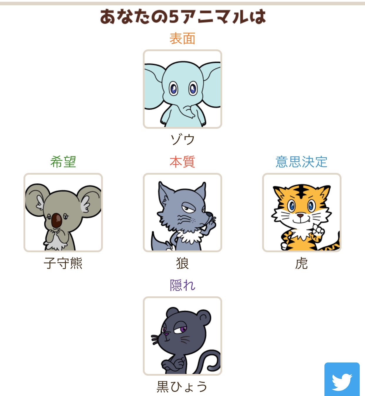 さぷり On Twitter あなたの5アニマルは本質 黒ひょう 表面 子守熊 意思決定 ゾウ 隠れ 狼 希望 こじか です Doubutsu Uranai 動物占い Https T Co 2qnsb2k8vt へー