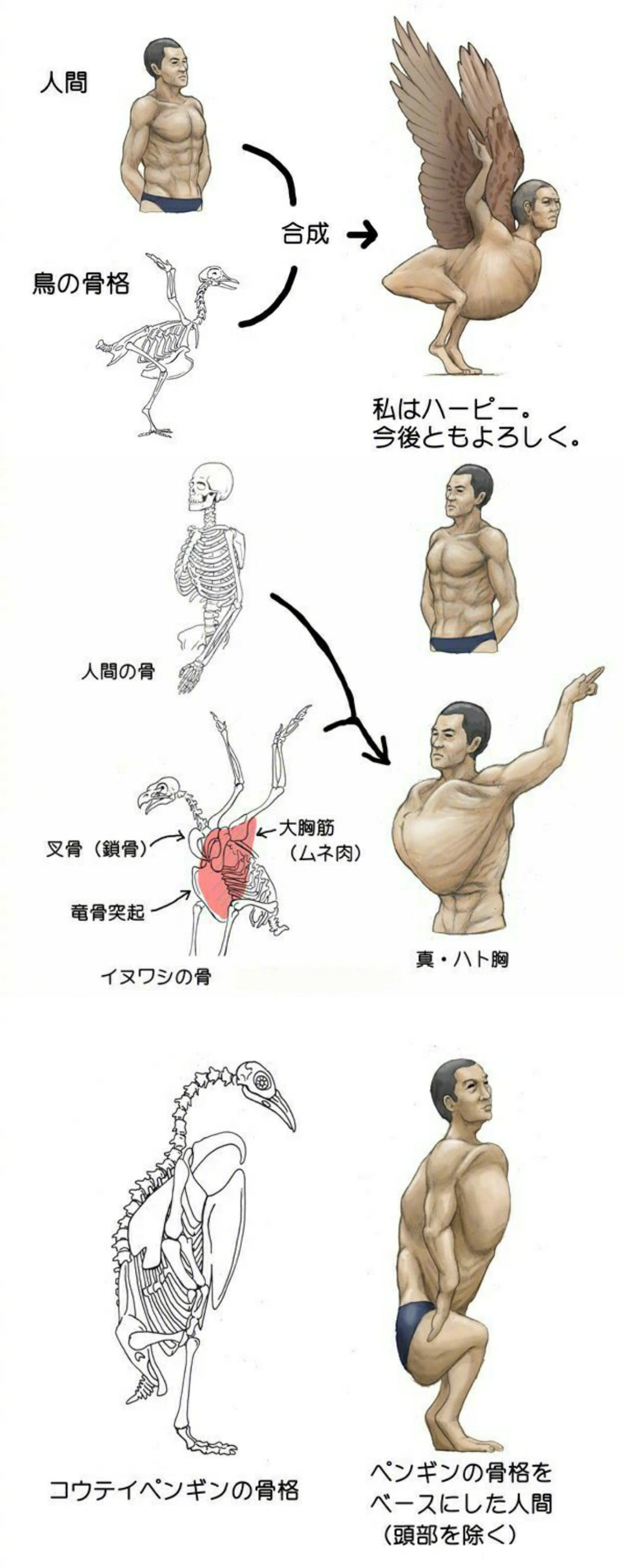 川崎悟司 On Twitter 前に 動物の足の骨格をベースにした人間の足 のツイートで ペンギンもしてほしいリクエストが多数ありましたが やってみたら それほどインパクトなくて ペンギンの体全体 頭部除く の 骨格ベースにした人間を描いてみました