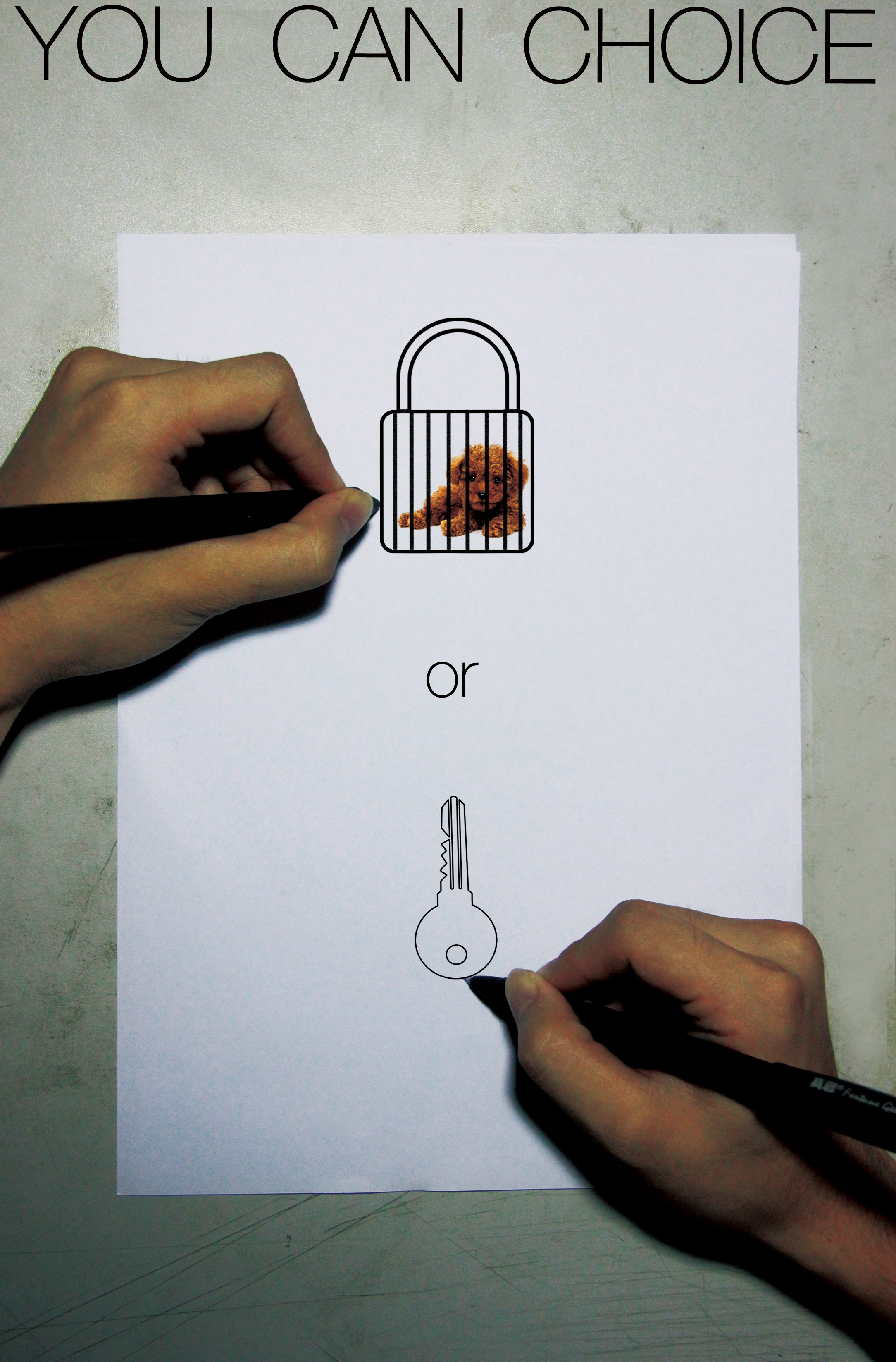 保护动物系列海报之一 画面表现的是人对动物的态度 这是可以选择的 是解救他们 还是虐待他们 用于呼吁大家选择保护动物不要虐待动物 注 狗的图片源于昵图网 手为原创