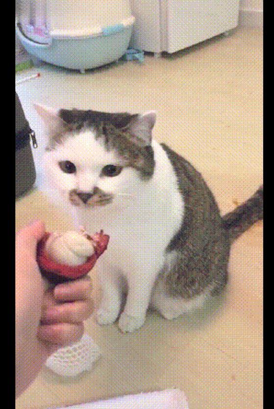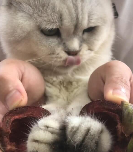 网友把剥开的山竹给猫咪看 它一脸的不敢相信