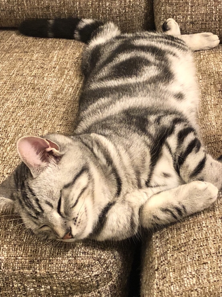 ソファの凹み最高 バンザイしてだらしない格好で寝るネコちゃん 笑 猫クラスタ
