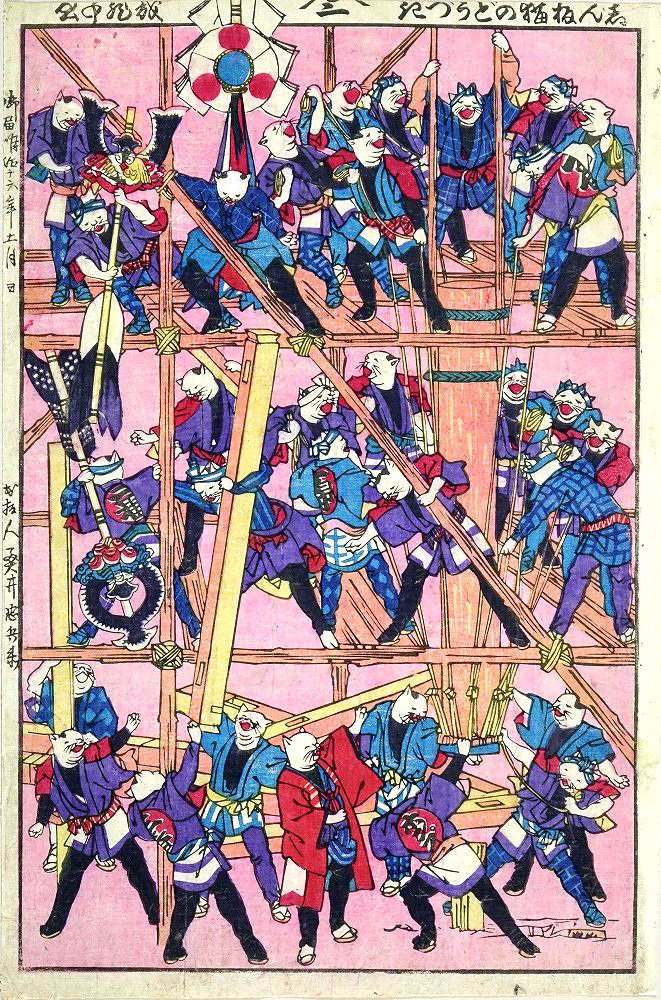 Twitter पर 一魁斎 正敏 浮世絵スキー 狼の護符マニア 数ある猫擬人化な浮世絵の中で 個人的に一番大好きなのがこちら 志ん板猫のどうづき 小林幾英 明治16年 1883 胴突き は建築で地固めの時に重い槌を数人で上げ下げする いわゆる
