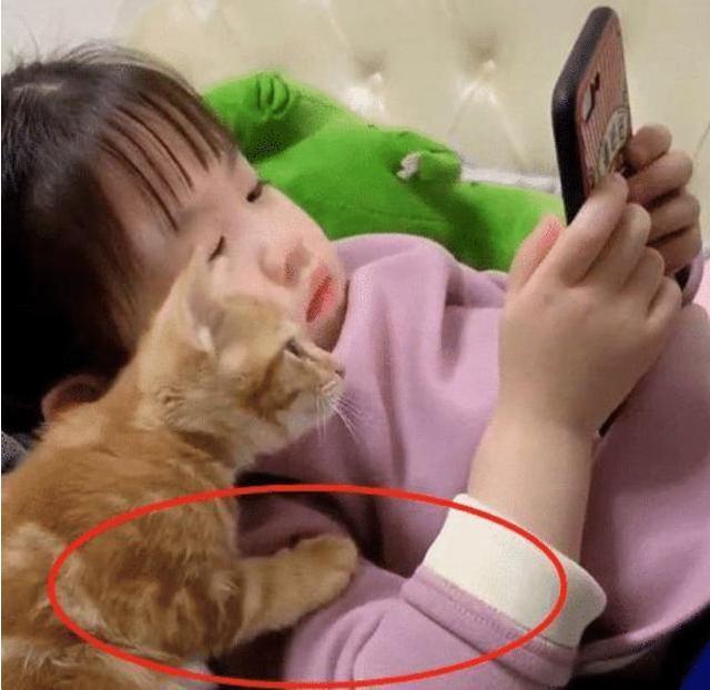 5岁女儿跟小猫一起看手机 宝妈过去一看乐够呛 这能看得懂吗
