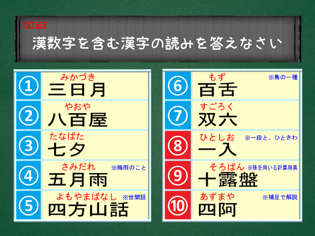 ট ইট র 書けそうで書けない漢字 それでは正解を発表します ㅂ و 参加して下さった皆さんありがとうございました No 63 正解 漢数字を含む漢字の読みを答えなさい Qさま風 Http T Co Tqvqp1tkun